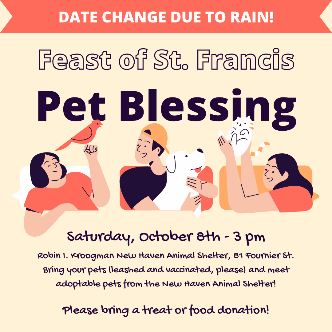 DATE CHANGE: Due to incoming rain, this fun event has been moved to Saturday, Oct. 8, at the Robin I. Kroogman New Haven Animal Shelter. Treat or food donations encouraged! Bring your pet (licensed and vaccinated, please) or stuffed animal at 3 p.m., receive the blessing and meet some of the adoptable animals from the shelter. Co-sponsored by #thecityofnewhavenhumanecommission#newhavenanimalshelter