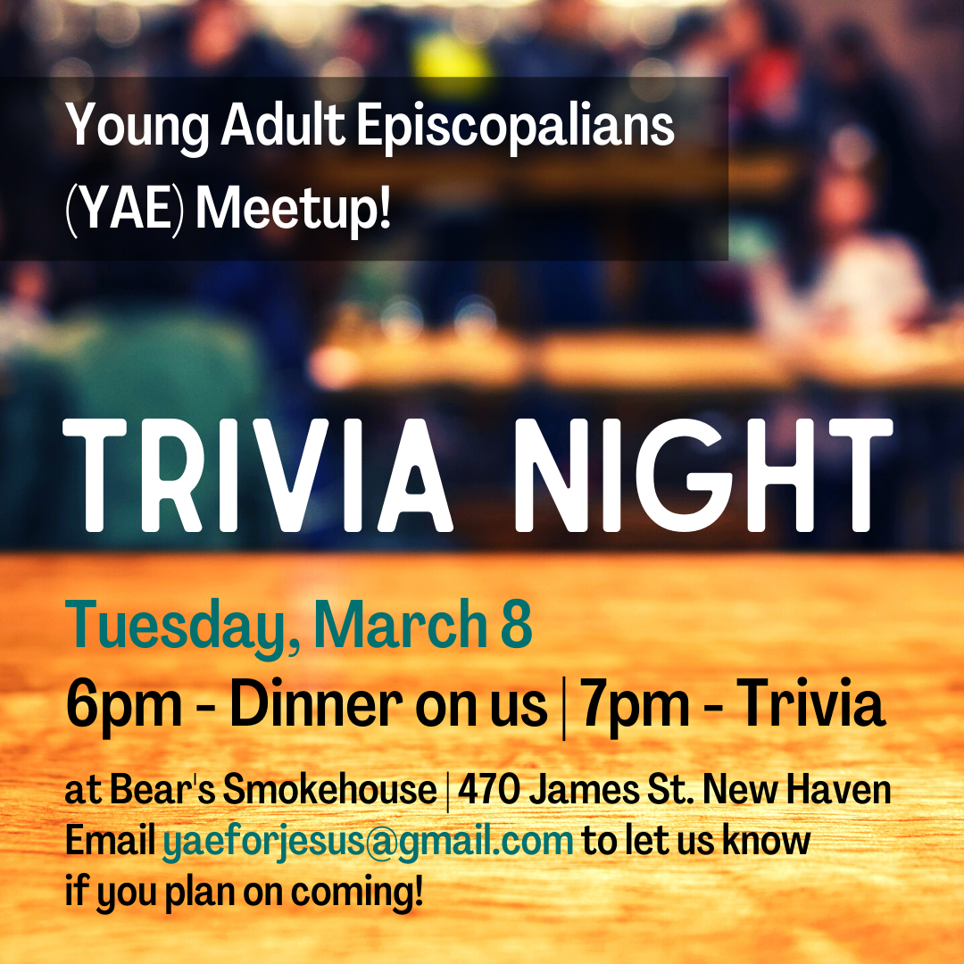 Join us for a Trivia Night at Bear’s! We’ll gather at 6pm for dinner (on us). Trivia begins at 7pm. Email yaeforjesus@gmail.com to let us know if you’re coming! YAE events are for young adults 21 to 39(ish).